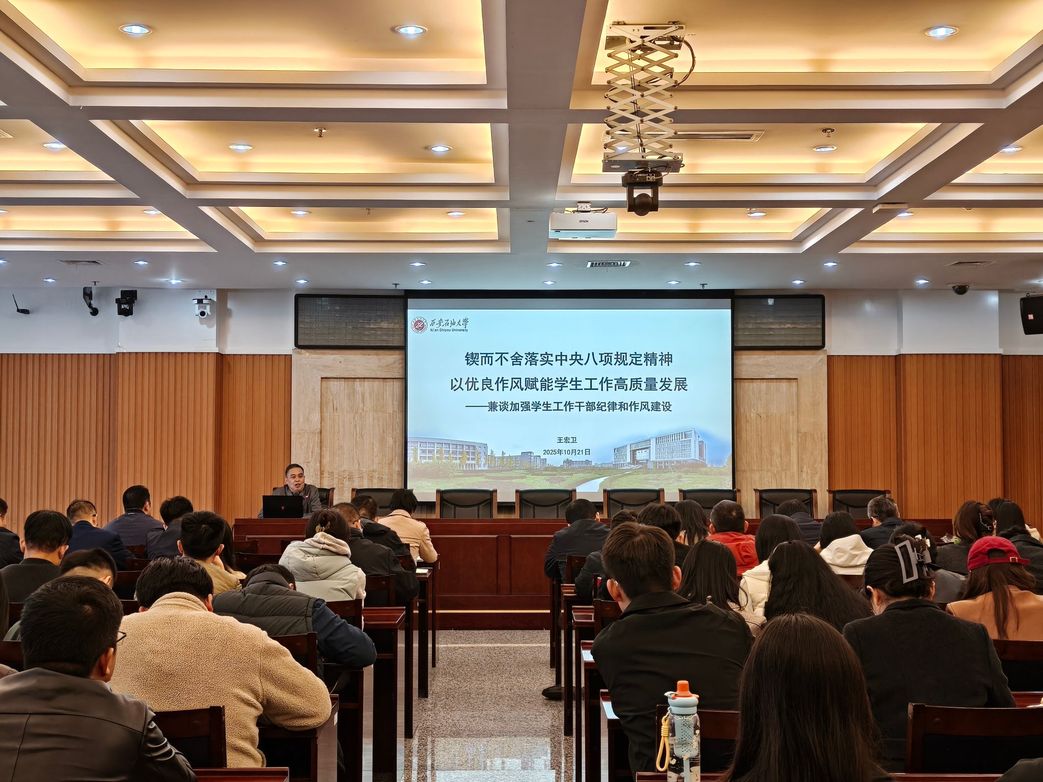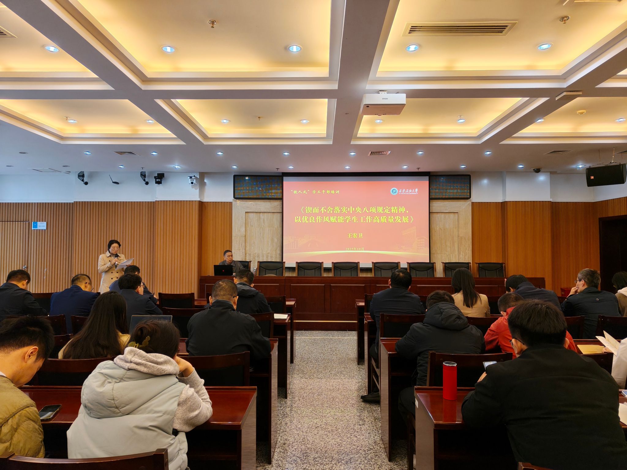 为深入落实中央八项规定精神,以优良作风赋能学生工作高质量发展,进一步强化学工干部纪律作风建设与立德树人履职尽责能力,2025年10月21日下午,学生工作部在鄠邑校区第一会议室举办“铁人式”学工干部专题培训第六讲。校纪委副书记王宏卫受邀作题为《锲而不舍落实中央八项规定精神,以优良作风赋能学生工作高质量发展》的专题报告,报告由学生工作部副部长毕轶慧主持,全体学工干部参加。