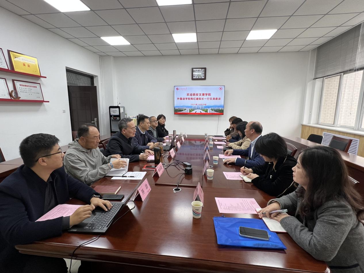 10月29日,西安文理学院外国语学院院长韩红建一行6人莅临我校外国语学院座谈交流。座谈交流会在鄠邑校区崇文楼314会议室召开。双方学院党政领导和骨干教师代表围绕办学思路、人工智能发展背景下外语学科发展思路的思考和实践、课程设置、课程体系建设、教学改革、人才培养质量等议题展开交流探讨。