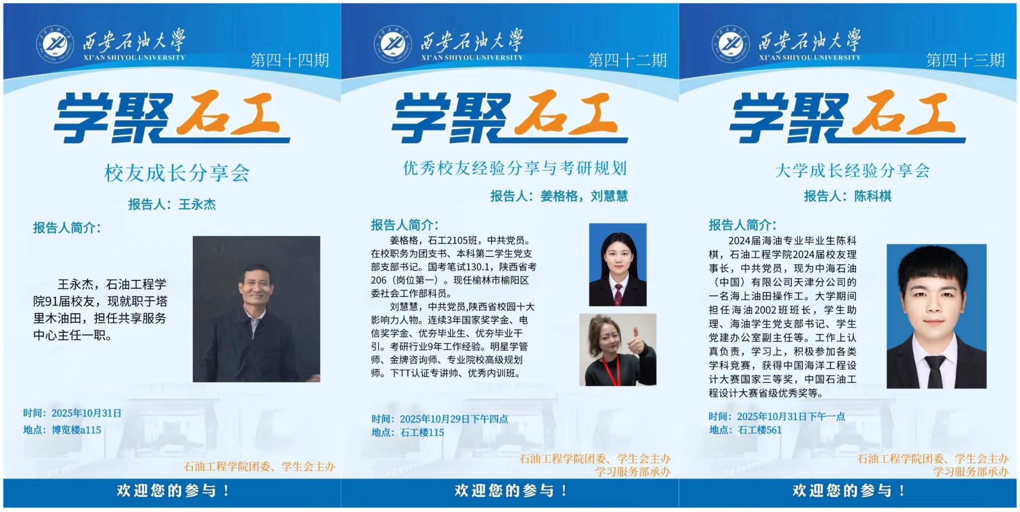 石油工程学院于10月29日至31日开展学风建设系列活动,通过邀请优秀校友与行业专家开展“小而精”的专题分享,以“早起步、精准化”的培养思路,助力学生明晰发展方向,为学院学风建设注入持续动能。