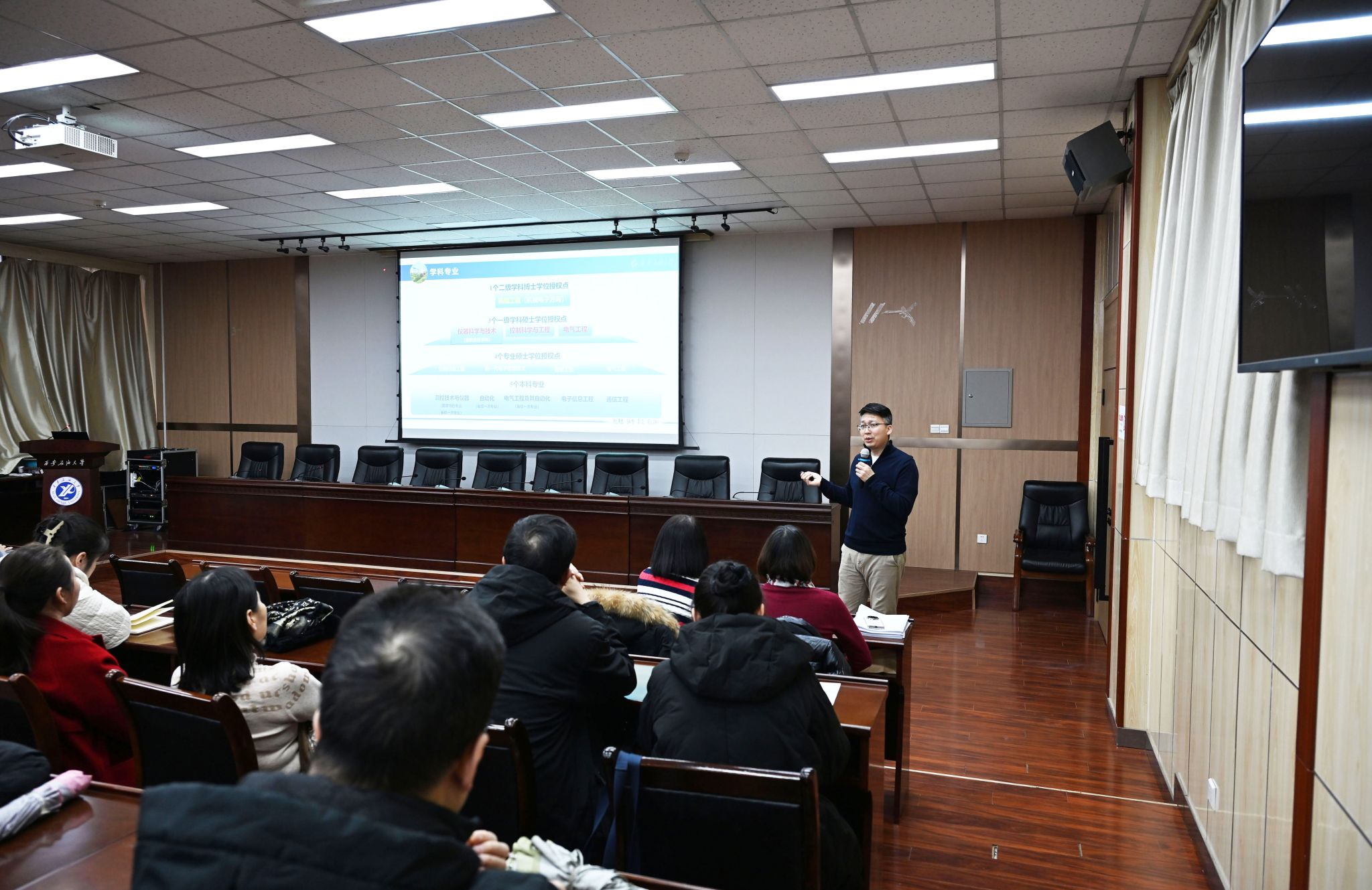 会议第一项为年终述职环节,李飞院长围绕学科发展作专题报告。他系统阐述了申报博士点的重要性与紧迫性,强调必须立足仪器学科实现突破。报告梳理了学院在科研、师资、人才方面的进展与不足,明确了“测、传、控、智”的特色方向及三个重点科研领域。李飞同时号召全院教师凝聚共识,以博士点申报和学科排名提升为核心目标,共同推动学院内涵式发展。