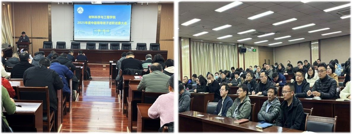 12月30日上午,材料科学与工程学院在雁塔校区第五会议室召开2025年度中层领导班子述职述廉大会。学院党委书记耿岭主持会议,全院教职工参加会议。本次会议以“凝心聚力谋发展,踔厉奋发新征程”为主题,全面回顾和总结了学院2025年在党建工作、科研创新、学科建设、人才培养等领域取得的突破性进展,并对进一步推动学院各项事业高质量发展作出动员部署。