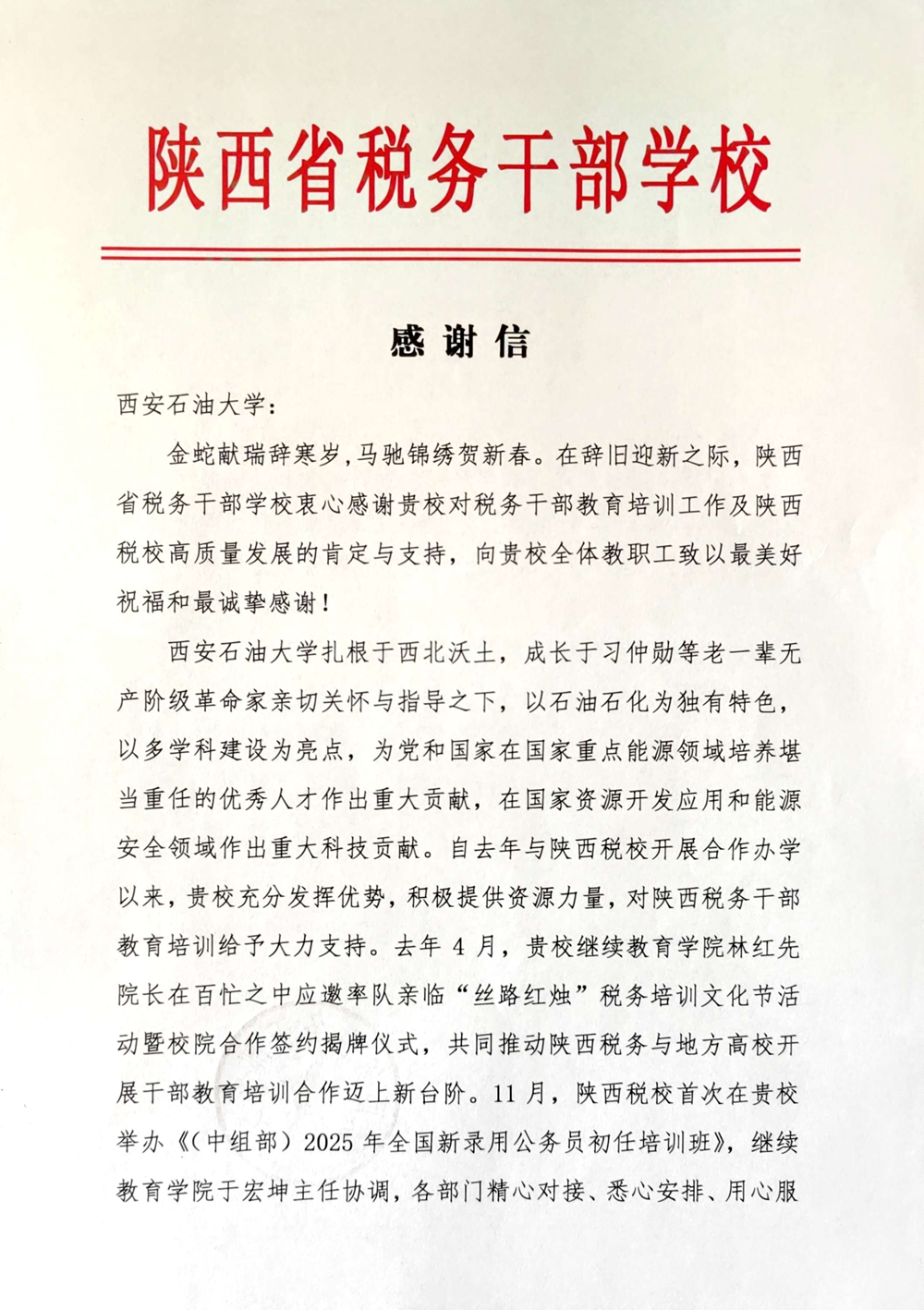 近日,陕西省税务干部学校向我校发来感谢信,对我校在过去一年中给予的支持与协作表示诚挚谢意,并高度肯定了双方在干部培训、资源共享与社会服务等方面取得的务实成果。