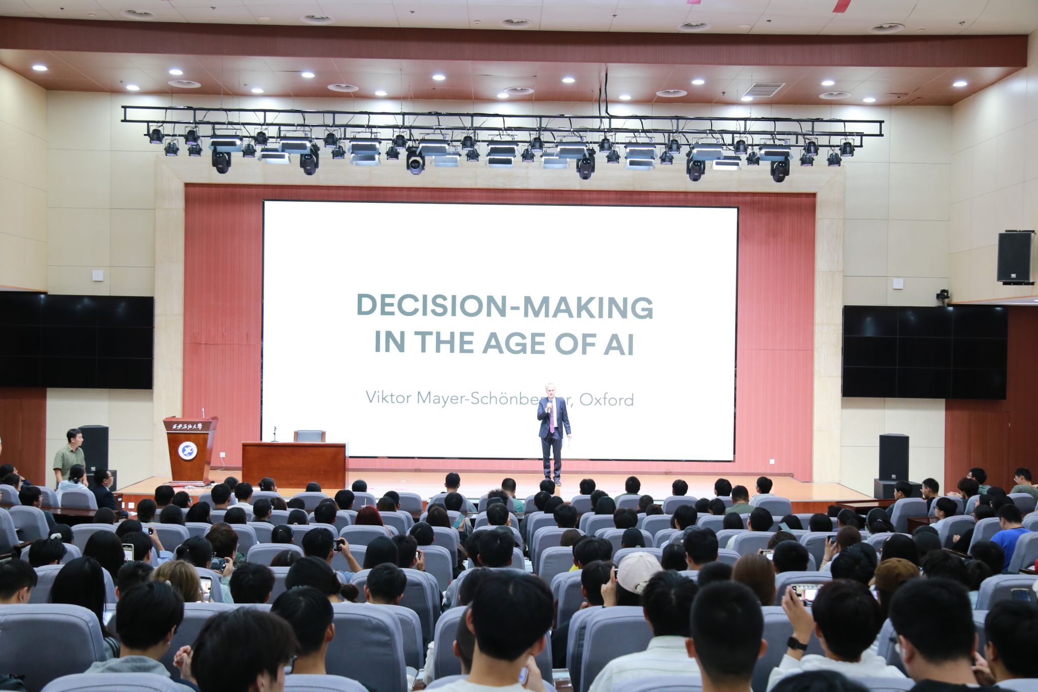 9月19日下午,我校第十四期终南山讲坛在鄠邑校区图书馆弘石学术报告厅举行。国际著名数据科学技术权威专家,牛津大学教授、耶鲁大学、芝加哥大学客座教授,《大数据时代》作者维克托·迈尔-舍恩伯格(Mayer-Schönberger)教授受邀作了题为“Decision-Making in the Age of Ai”(人工智能时代的决策)的学术报告,带来了一场关于数据、AI与人类决策智慧的学术盛宴。科研处、计算机学院有关负责人,理学院、计算机学院、电子工程学院师生等近400人参加报告。