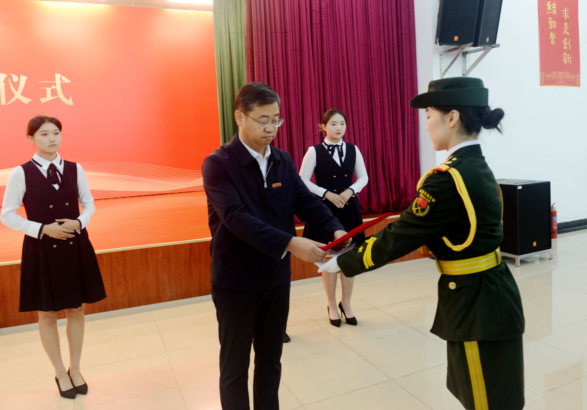 上午8时,仪式在庄严的氛围中正式开始。校长王进富将获赠的国旗及证书郑重交予学校国旗护卫队,国旗护卫队队员神情肃穆,步伐铿锵,庄严地护送国旗入场。这面国旗旗长5米、宽3.3米,为超大国旗,整幅旗面无拼接,五颗星由织造人员手工缝制,工艺特殊,承载着亿万中华儿女的深厚爱国情怀,也凝聚着我校建校70周年的特别纪念。