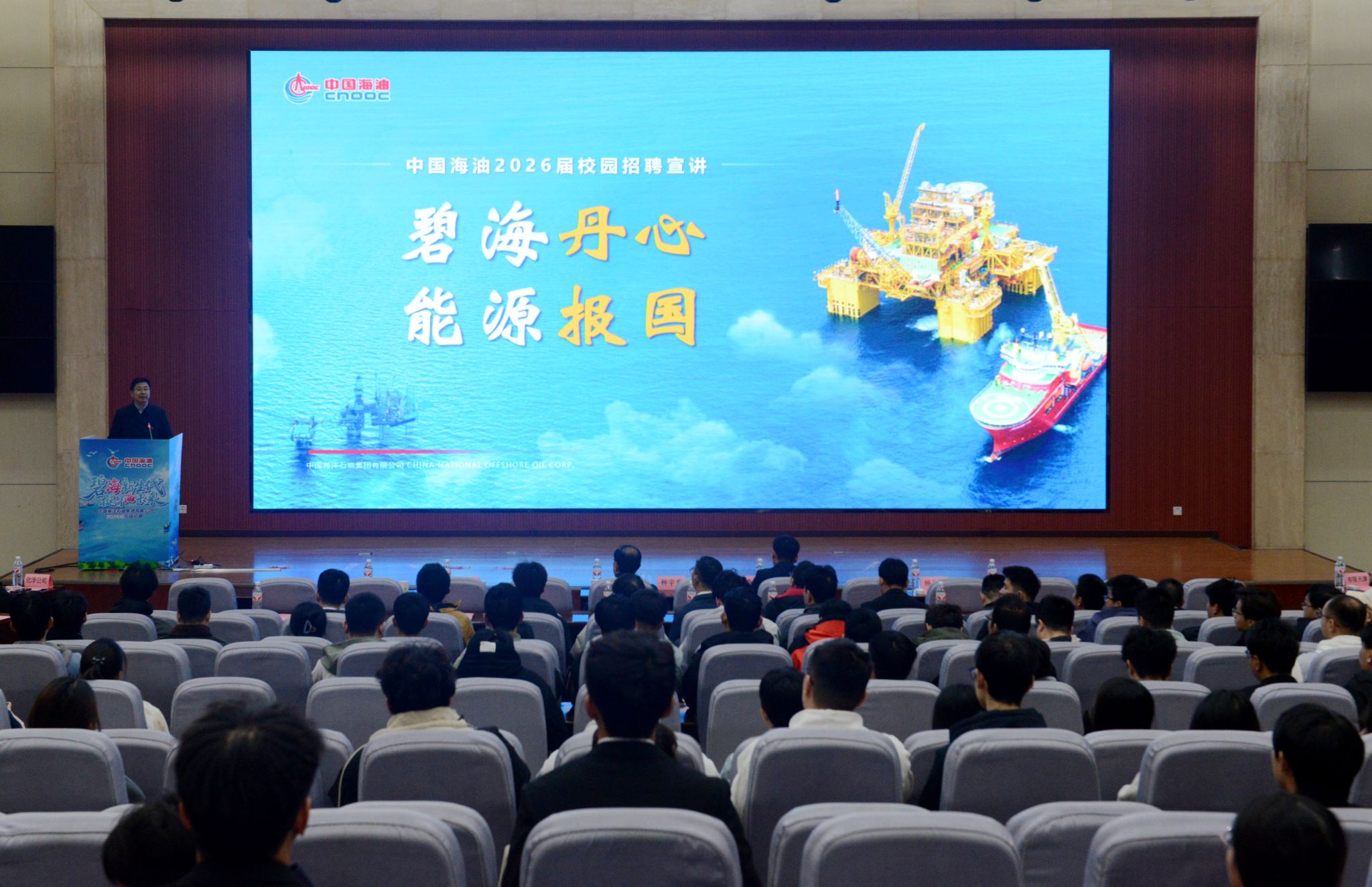 10月21日上午,中国海洋石油集团有限公司2025年秋季校园招聘宣讲会在我校鄠邑校区弘石学术报告厅举行。副校长种宇宏出席会议。中国海油各单位招聘代表,学校就业创业指导中心全体成员,各院(系)学生工作主要负责同志,毕业班辅导员,2026届毕业生代表300余人参加会议。会议由学生工作部(处)部(处)长、就业创业指导中心主任王亮主持。