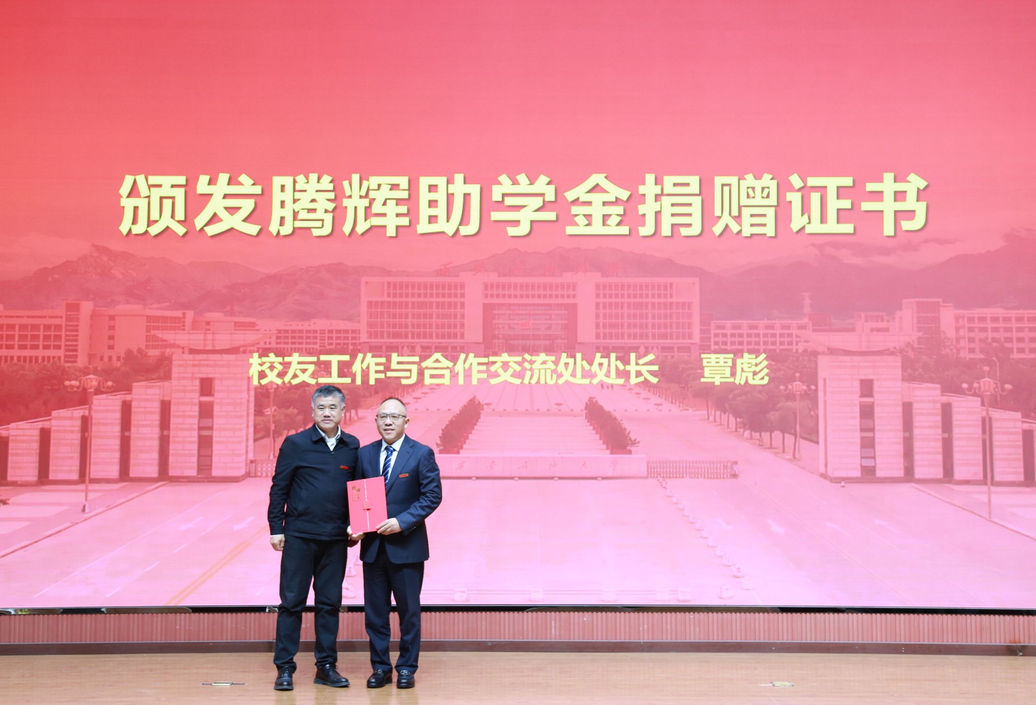 活动伊始,《腾辉二十载・薪火照初心》主题视频缓缓播放,一个个温暖瞬间、一段段成长故事,生动再现了腾辉助学金自2006年设立以来的二十年坚守与温情,让现场每一位观众都深切感受到这份爱心的力量。随后,校友工作与合作交流处处长覃彪详细地介绍,二十年来,何荣校友每年慷慨出资10万元,近年来我校窦益华教授也坚持每年捐资2万元,他们的仁心善举,温暖了处于困境中的诸多学子,让这份助学金成为我校资助育人事业中最动人的品牌。