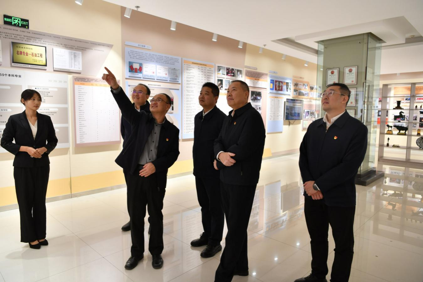 杨健、焦群朝一行与副校长赵健、党委办公室(校长办公室)负责同志共同参观我校铁人王进喜纪念馆和校史馆,开展沉浸式学习交流。大家先后在铁人王进喜纪念馆钻井设备实物、会战场景复原展区及校史馆校友事迹、学校发展成果展前驻足停留,在珍贵史料与生动场景中追寻精神根脉、感悟办学初心。赵健结合展区实物与历史背景,深入解读了铁人王进喜“攻坚克难、无私奉献”的精神内核,详细讲述了学校自创办以来,从服务行业发展到助力国家能源事业高质量发展的奋进历程。在参观过程中,双方围绕党建赋能、文化传承、人才培养等内容深入交流,在精神共鸣中凝聚合作共识。