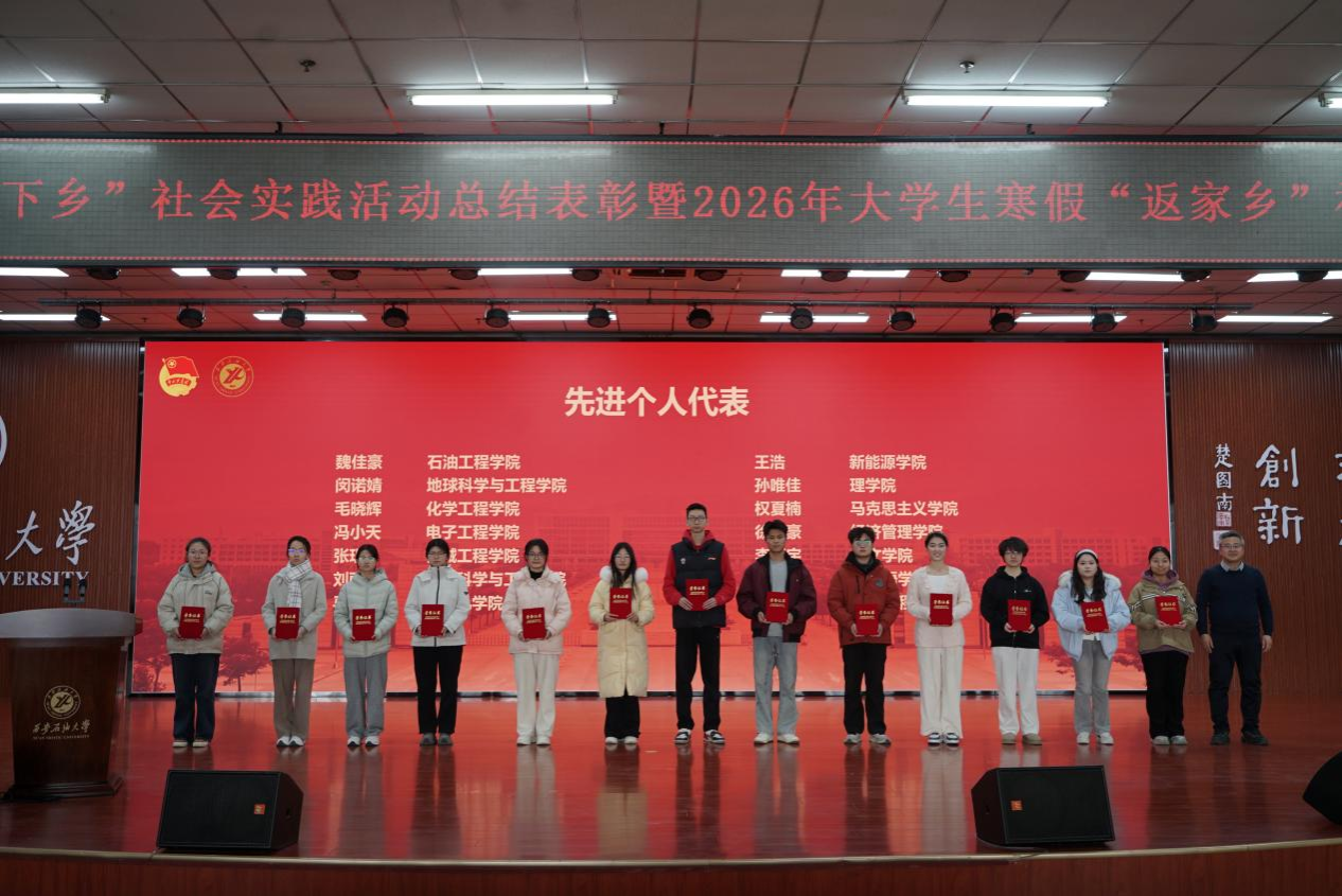 种宇宏代表学校对在2025年大学生暑期“三下乡”社会实践中获奖的团队和个人表示衷心的祝贺,对在社会实践工作中辛勤付出的指导教师和工作人员表示诚挚感谢,同时对即将参加2026年大学生寒假“返家乡”社会实践的全体师生表示亲切的问候和诚挚的祝福。他从我校连续36年组织学生赴延安开展社会实践的历史传承出发,结合“青春为中国式现代化挺膺担当”的时代主题,系统总结了本年度社会实践所取得的丰硕育人成果,并对未来深化实践育人工作提出要求。他就高质量推进我校大学生社会实践工作提出了四点希望:一是筑牢信仰之基,在实践感悟中坚定理想信念。希望大家将社会实践作为学习领会党的创新理论的生动课堂,在深入基层、观察国情、服务群众中坚定“听党话、跟党走”的政治自觉,将个人理想追求融入国家和民族的事业;二是锤炼过硬之能,在知行合一中增长智慧才干。要秉持学以致用的态度,将专业知识与社会实践紧密结合,尤其要立足我校石油石化等特色学科优势,在解决实际问题中磨炼意志、培养作风、提升综合能力;三是提升实践之效,在精心组织中服务社会发展。要推动社会实践与专业教育、思政教育、就业引导深度融合,设计“小而精、真而实”的项目,探索建立成果转化机制,实现服务社会与自我成长的双赢;四是恪守安全之责,在严密保障下实现行稳致远。必须将安全放在首位,认真做好行前教育培训、应急预案制定和过程管理,确保实践活动都安全、有序、顺利开展。