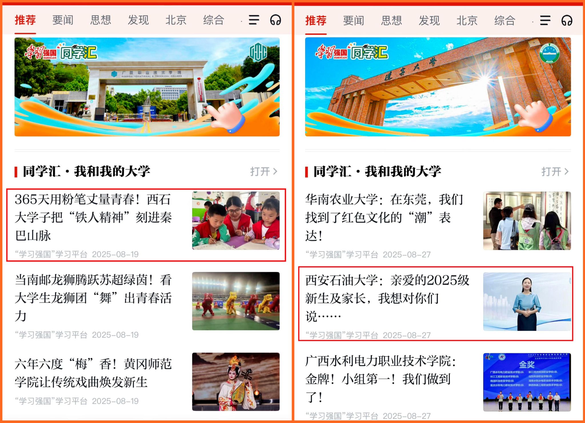 “同学汇”是“学习强国”学习平台为贯彻落实习近平总书记关于加强和改进高校思想政治工作的重要论述,面向高校、服务大学生而研发的一款主流融媒体产品,支持高校发布图文、短视频等多种形式内容。2025年以来,“西安石油大学:祝你高考落笔生花,共赴能源报国梦”“西安石油大学学子暑假在干嘛?看这里”“365天用粉笔丈量青春!西石大学子把‘铁人精神’刻进秦巴山脉”“西安石油大学:亲爱的2025级新生及家长,我想对你们说……”等内容多次获得“学习强国”学习平台“推荐”频道相关栏目首页推荐。学校11次上榜一月一期的“学习强国”同学汇高校榜,进一步提高了学校的影响力和美誉度。