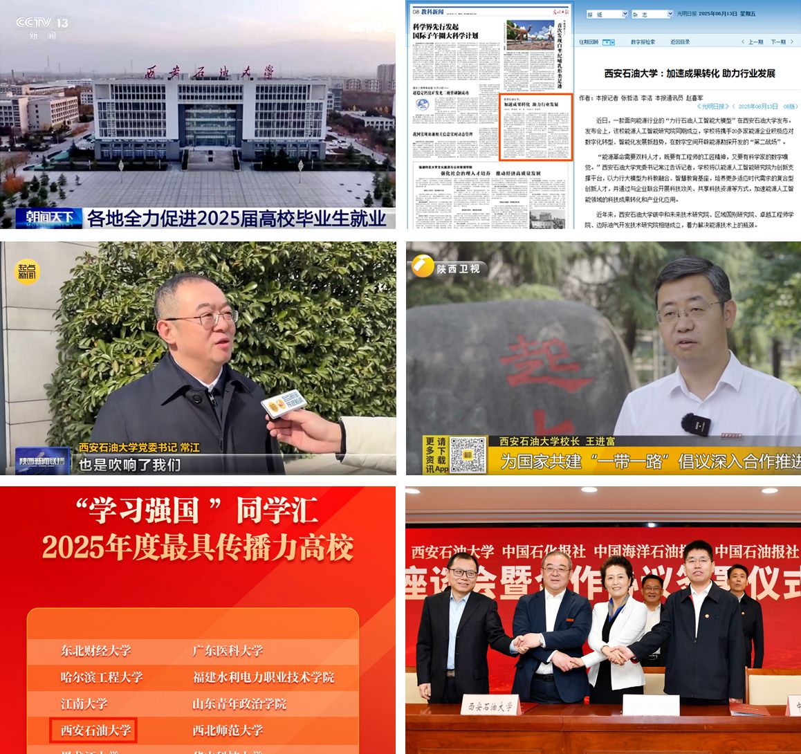 主流媒体传强音,权威发声铸品牌。一是坚持主动策划、精准对接,筑牢主流媒体宣传阵地,以权威发声彰显办学实力。中央电视台、《光明日报》、陕西广播电视台、《陕西日报》等中省主流媒体全年聚焦学校发展,开展深度报道40余次,从教学改革的创新实践到科研攻关的重大突破,从校园文化的蓬勃发展到师生风采的鲜活展现,全方位、多角度呈现了学校各项事业的丰硕成果。二是深耕“学习强国”平台建设,充分发挥其思想引领与传播赋能作用,学校获评“学习强国”同学汇“2025年度最具传播力高校”,11次跻身月度高校热度榜。《西安石油大学学子暑假在干嘛?看这里》《365天用粉笔丈量青春!西石大学子把“铁人精神”刻进秦巴山脉》等优质内容多次荣登平台首页推荐,引发广泛关注。同时,积极为“学习强国”陕西学习平台供稿,供稿量、发稿量及总平台采用量均位居全省高校首位,持续传递西石大正能量。三是深化行业校媒合作,与《中国石油报》《中国石化报》《中国海洋石油报》签署四方合作协议,聚焦“大思政课”建设、新闻传播人才培养等核心领域深化协同,探索出能源行业主流媒体与高校融合发展的新路径、新范式,进一步强化了学校在能源领域的品牌辨识度。
