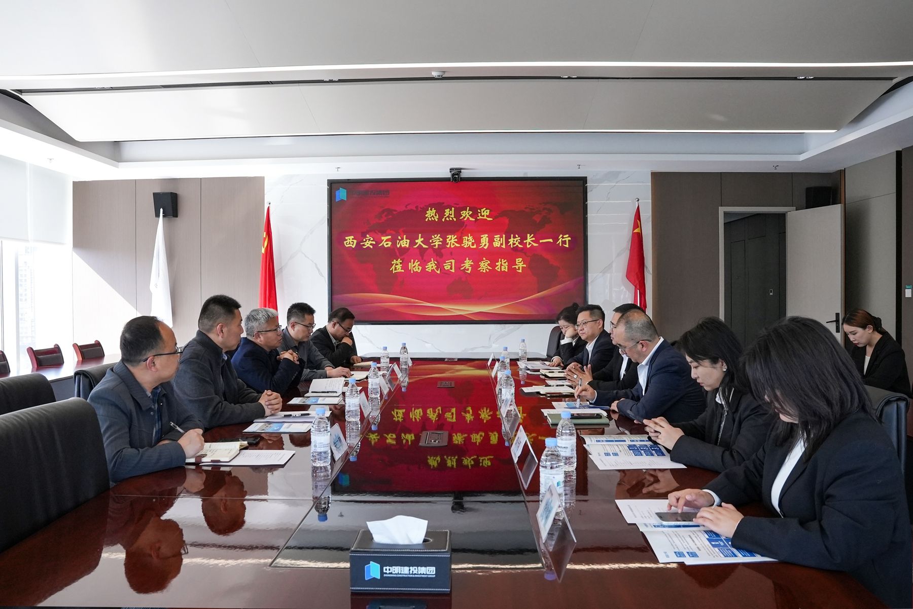 为进一步深化校企合作,3月31日,副校长张骁勇带队赴中明建投建设集团有限责任公司(以下简称“中明建投”)走访交流,与中明建投总经理高良、党支部书记霍炎、常务副总裁董斌(我校2014届校友)举行交流座谈。我校后勤处、继续教育学院负责人和管道工程学院教师代表随同走访。