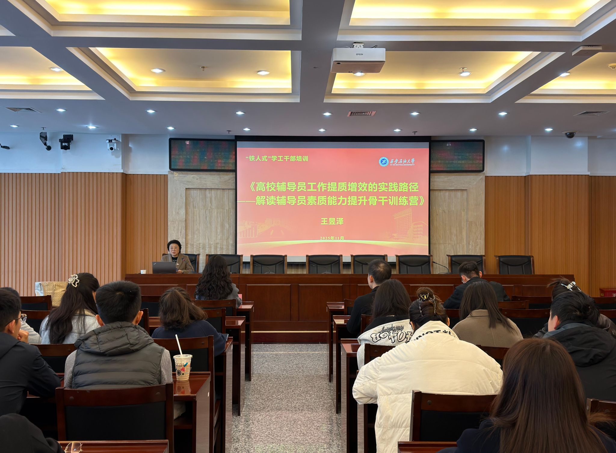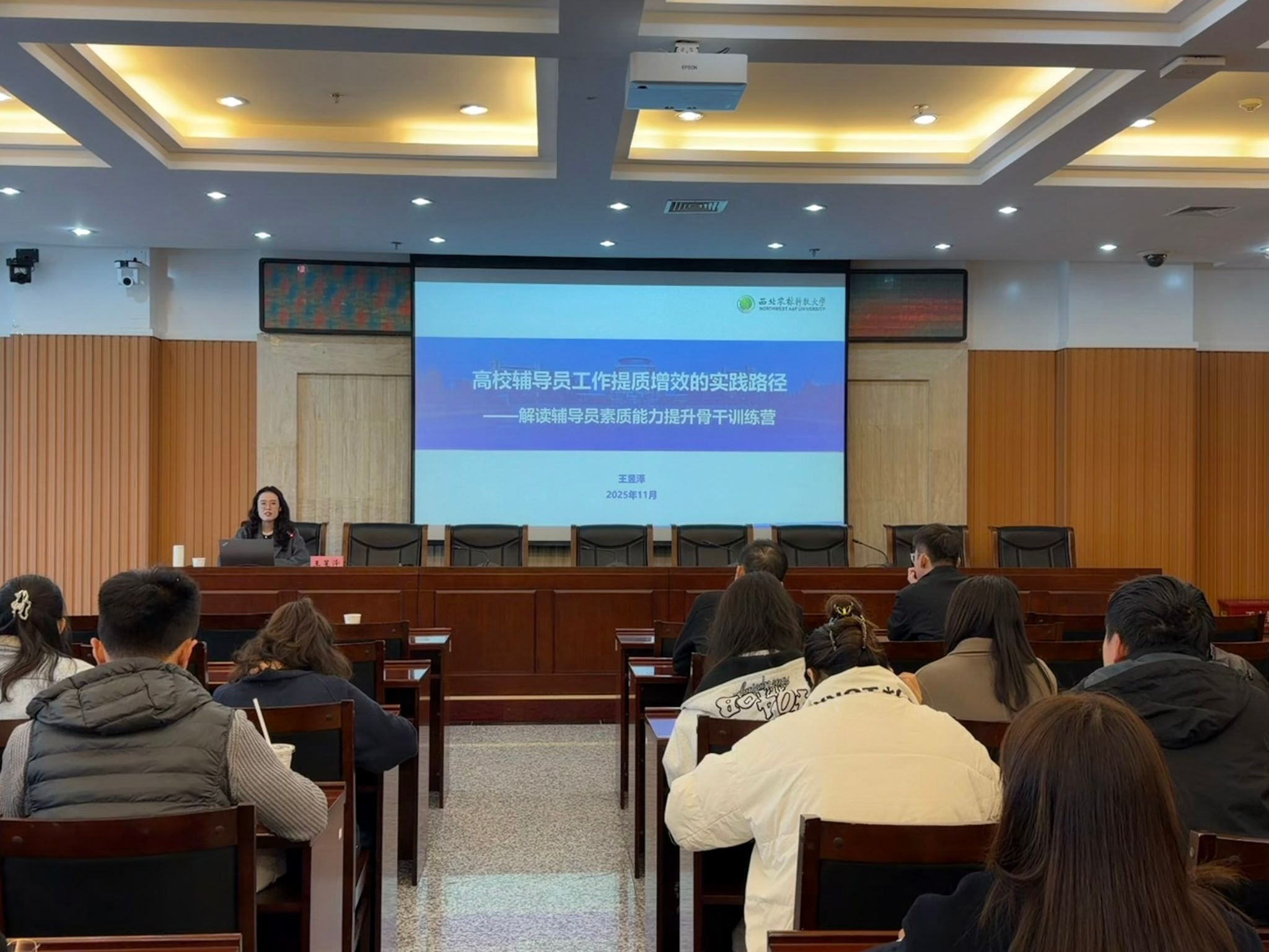 为进一步提升我校学工干部专业素养与工作实效,落实立德树人根本任务,11 月 3 日上午,我校在鄠邑校区图书馆第一会议室举办 “铁人式” 学工干部培训第七讲。本次培训邀请西北农林科技大学资源环境学院团委书记兼学生工作秘书王昱泽,作《高校辅导员工作提质增效的实践路径 —— 解读辅导员素质能力提升骨干训练营》专题报告。培训由学生工作部副部长毕轶慧主持,全体学工干部参加。