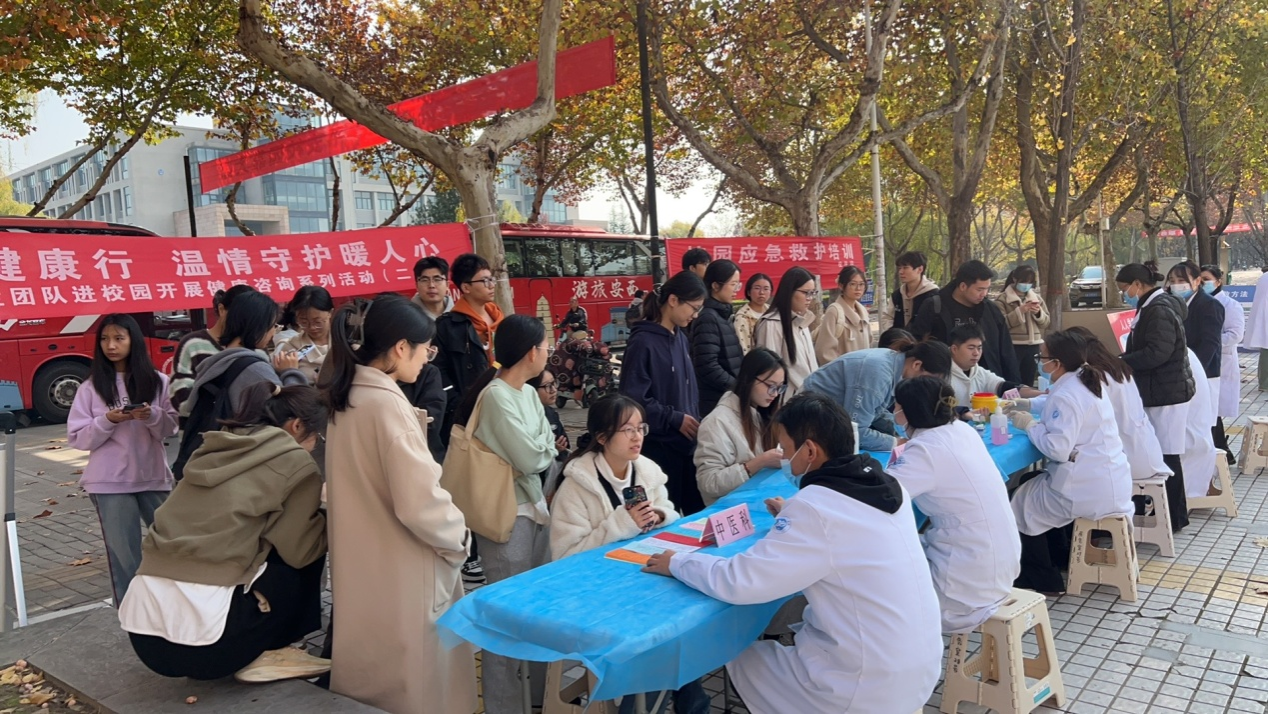 在雁塔校区,医护人员怀着饱满热情,为近百名师生及离退休职工开展免费血压血糖检测、慢性病管理指导、中医体质辨识等服务,针对秋冬季常见传染病进行科普宣讲,用专业知识为健康“把脉问诊”;鄠邑校区活动现场暖意融融,金黄银杏与暖阳相映成景,中医诊疗人气火爆,骨干中医大夫通过“望、闻、问、切”传统手法,为师生诊断疾病、指导生活方式调整及用药建议,助力改善亚健康状态,现场排队队伍全程未断,医护人员坚守岗位直至看完最后一位咨询者。