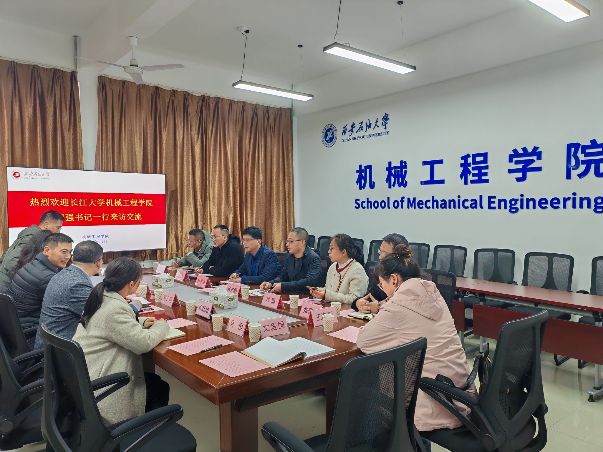 11月14日上午,长江大学机械工程学院党委书记杨德强一行七人来访我校机械工程学院,围绕学科建设与工程教育专业认证等议题开展深度交流座谈,共商内涵式发展大计。座谈会由机械工程学院院长刘少胡主持,学院班子成员、专业负责人、实验中心主任和相关管理人员参会。