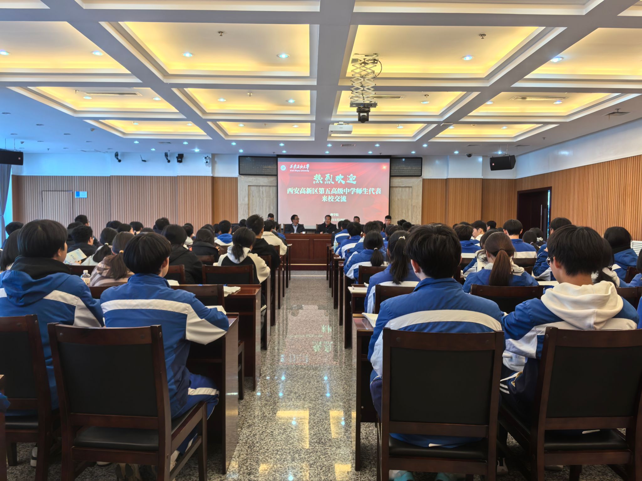 2025年11月19日下午,西安高新区第五高级中学(以下简称五高)受邀来我校开展研学活动,校长刘占权带领师生代表100余人参加活动。理学院招生宣传工作组代表学校接待五高师生并在鄠邑校区第一会议室举行简短的欢迎仪式。理学院党委书记席利哲、副院长马儇龙、理学院教授兼五高科技副校长郭文阁及理学院教师代表参加欢迎仪式。欢迎仪式开始前,与会人员在图书馆南门台阶前合影留念。欢迎仪式上,席利哲代表学校及理学院对五高师生代表的到来表示热烈欢迎,并简要介绍了研学活动行程和学校概况。