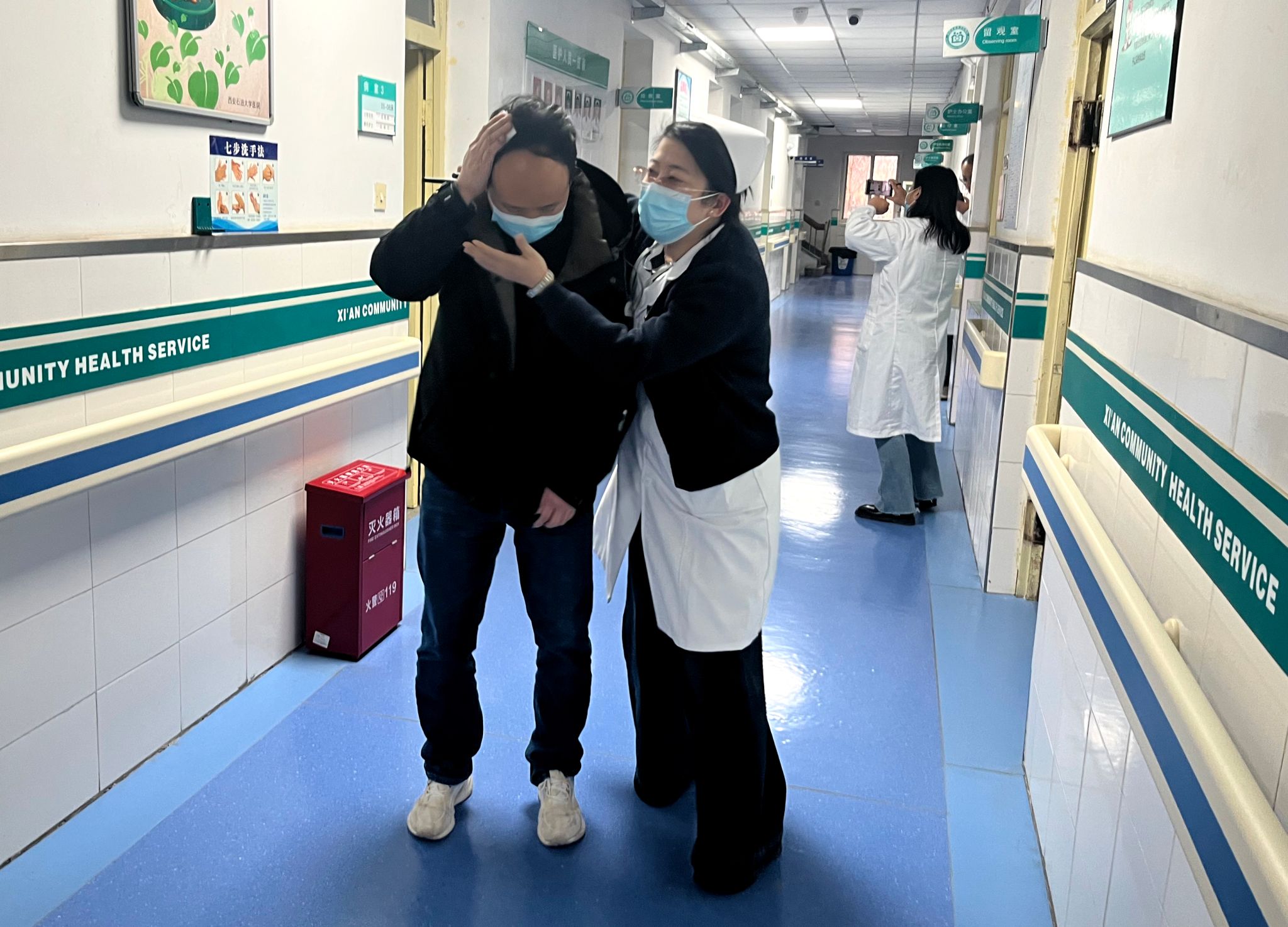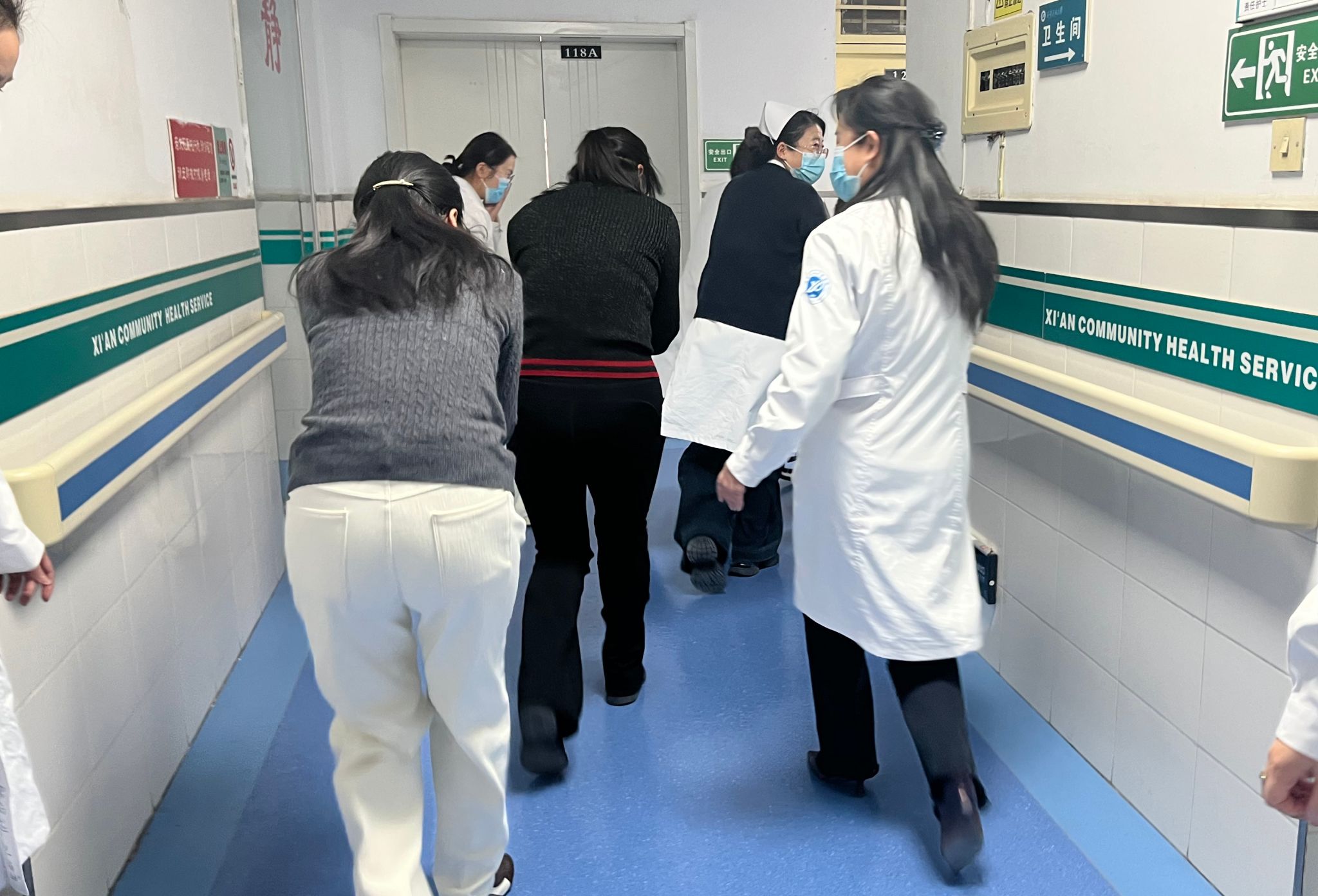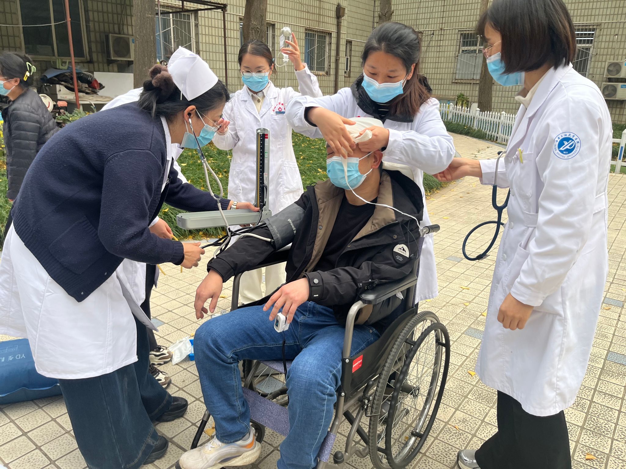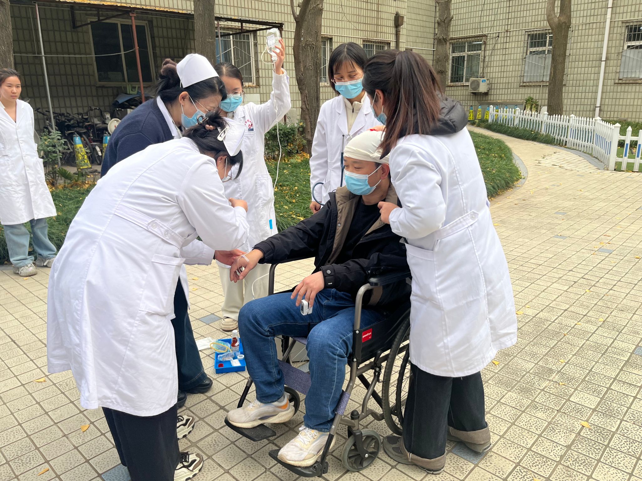 与此同时,疏散引导人员快速打开安全出口,引导就诊患者及医护人员用湿毛巾捂住口鼻,弯腰低姿沿预定疏散路线快速撤离。针对行动不便的模拟患者,工作人员采用搀扶、轮椅转运等方式全程协助,做到不推挤、不遗漏,确保所有人员在规定时间内安全撤离至室外指定集合点,各小组随即快速清点人数并向指挥部汇报。医院应急医疗小组同步在疏散现场搭建临时救护点,丁丽团队全力协助医疗演练开展,配合做好救护物资转运、模拟患者伤情配合、救治现场辅助等工作,助力医疗小组高效完成伤口处理、吸氧、头部包扎等紧急救治流程,充分彰显医疗应急处置的专业性与团队协作的高效性。