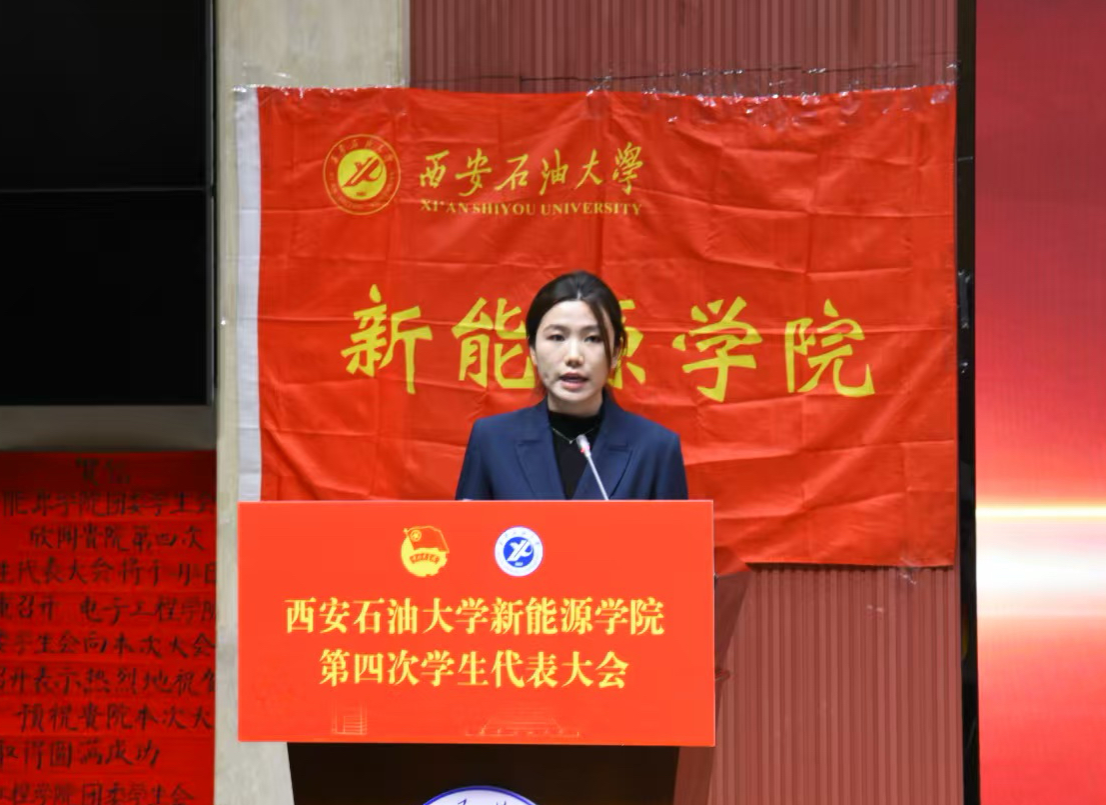 12月8日,西安石油大学新能源学院第四次学生代表大会在鄠邑校区弘石报告厅隆重召开。校团委副书记王军策,新能源学院党委书记颜庭星、党委副书记袁家宝出席会议,校学生会及兄弟学院学生会代表受邀参会,学院各年级团总支书记与全体学生代表齐聚一堂,共商学院学生工作发展大计。