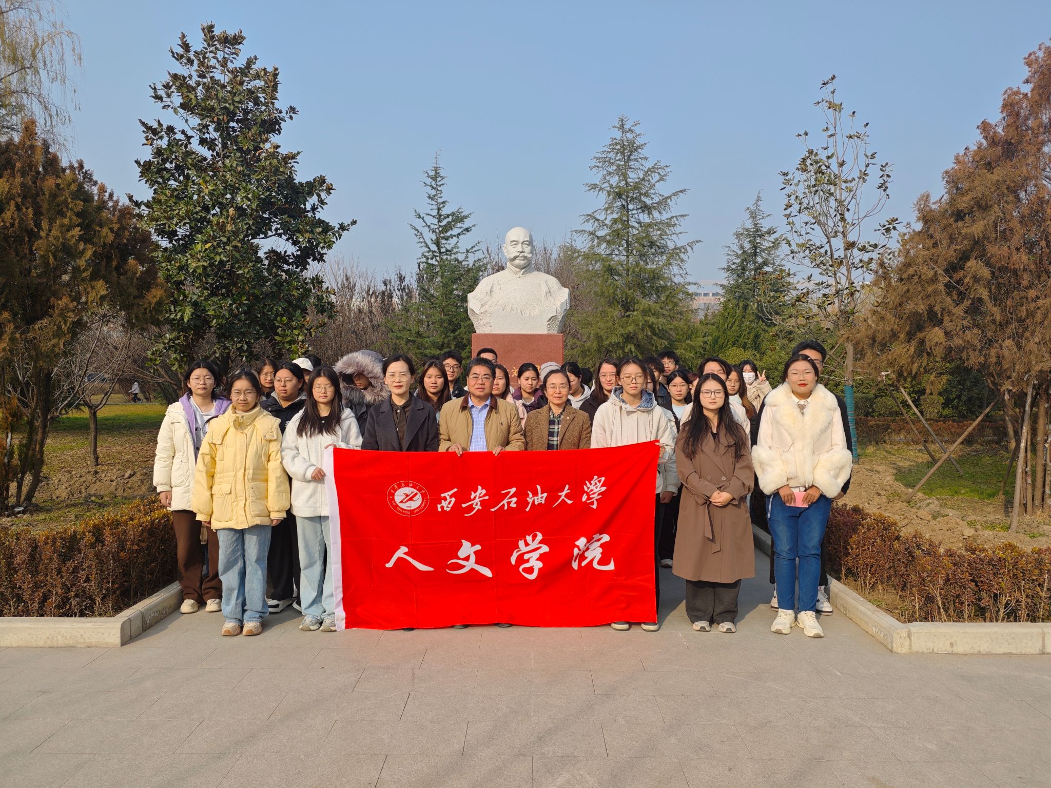 本次主题诵读活动是陕西省课程思政示范课“诗词创作与吟诵”课的教学实践活动,目的是让同学们在先贤精神的浸润下,实现专业学习与课程思政的深度融合。杜斌丞雕像是校园文化新地标,更是爱国主义教育的重要场所。此次教学实践活动的开展,以诗为媒、以声传情,深切缅怀学校办学的重要奠基人之一杜斌丞先生,以弘扬其爱国精神与教育家情怀。