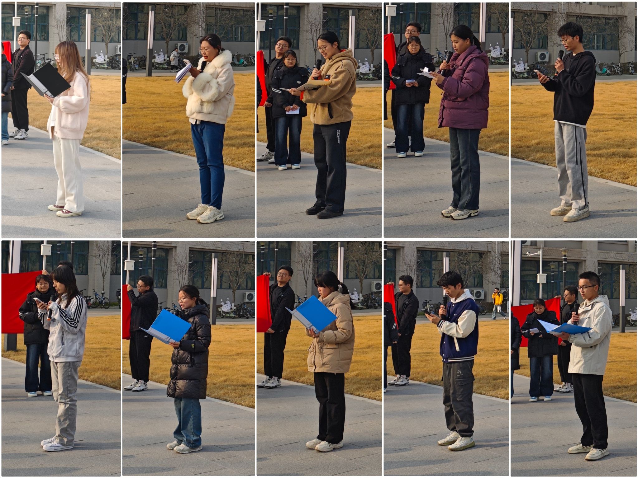 诵读环节,来自中文2401班的王雨彤、牟徐徐、路斯洋、王梦瑶、杨帆、杨景雁、袁清泉,与中文2402班的苏梦涵、付福临、孙壬林等10位同学依次登台,以诗抒怀、以声传情,他们以饱含真情的语调朗诵自己创作的廉洁主题诗歌。作品或以诗赞颂赤诚初心、凝聚千年廉政佳话,或借韵致敬清官风骨、咏叹刚正坚守品格,或直抒报国追求、彰显清廉雅韵,或细述廉吏传奇、展现淡泊自适之乐。字字掷地有声、句句饱含真情,将对廉洁精神的尊崇与向往,化作回荡在广场的清越之声,让在场师生皆深受感染与触动。