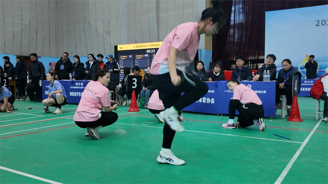 本次赛成功举办,依赖于严谨周密的组织保障团队。主办方严格遴选裁判团队,赛前经系统培训与考核认证,执裁时目光如炬、计录精审,更于间歇反复磋商尺度,以专业与公信捍卫赛事天平。志愿者团队尽职尽责,从引导疏通、物资整备到流程衔接无不悉心安排,他们是赛场内外最温情的纽带。医疗团队全程驻守,专业医护与急救物资齐备,为选手安全完赛提供无声而坚实的守护。西安石油大学倾力支持,提供一流的场馆设施,更在安保、后勤等方面全面护航,为这场盛会奠定了最可靠的运行基座。我校体育学院徐小仙老师说:“学校高度重视本届赛事的组织与服务,体育学院始终致力于搭建高水准体育平台,将跳绳纳入大学体育课程,推动这项运动在校园中的普及与发展。”