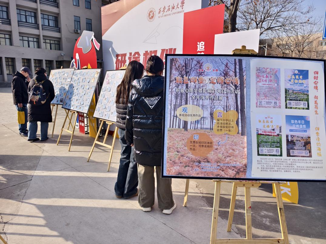 2025年12月19日,“取色四季 定格心情”积极心理学微影响21天打卡系列活动全年优秀作品展在我校崇文楼东北角江汉林广场举办。学生工作部(处)(学生心理成长指导中心)、人文学院相关工作负责人出席活动。