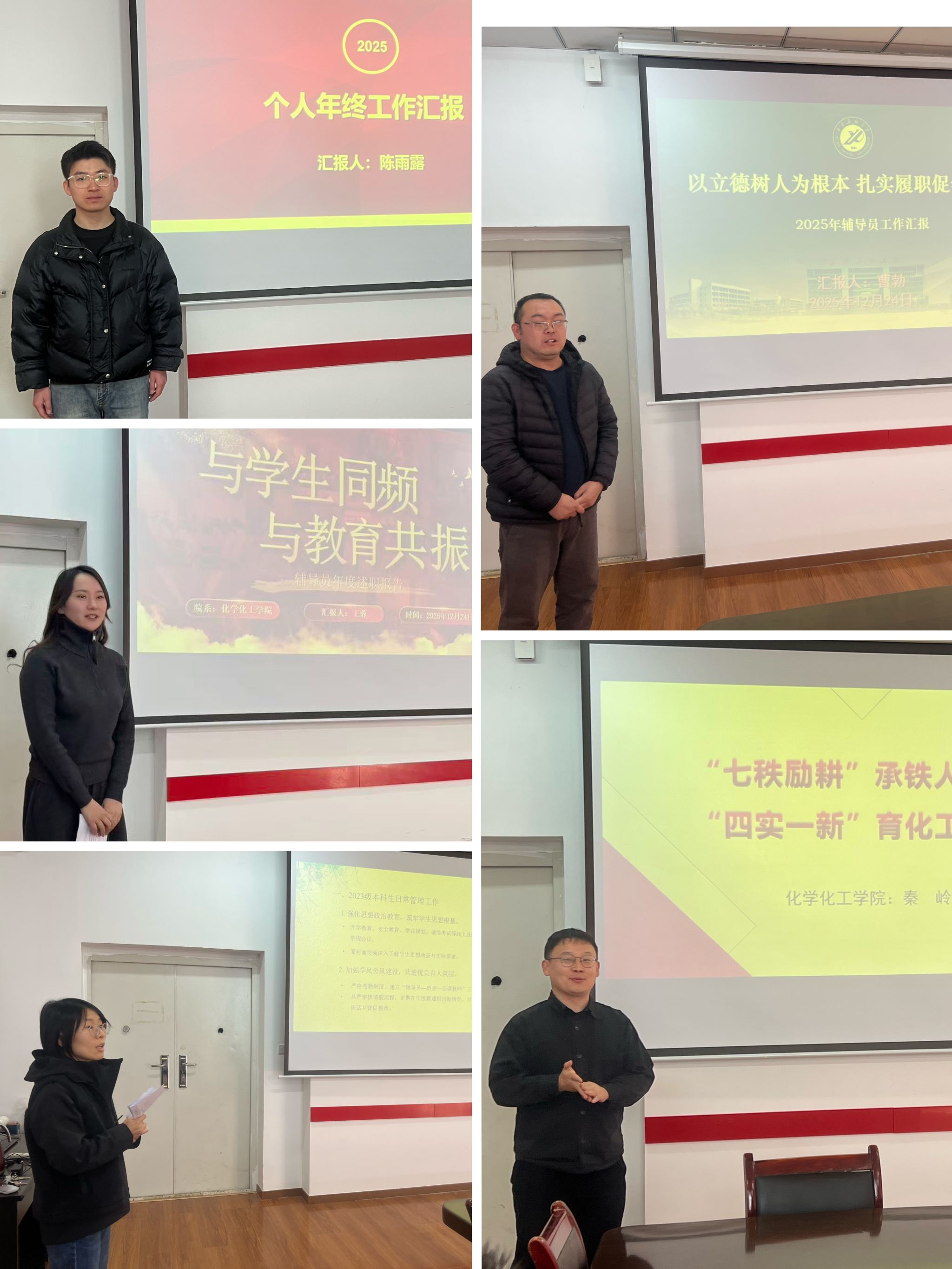 为进一步加强辅导员队伍建设,全面总结学院年度学生工作成效,提升育人工作科学化、精细化水平,12月24日下午15:00,化学化工学院于学院316会议室召开2025年度辅导员工作述职会,学院各年级辅导员参加述职。会议由学院党委副书记乔晓主持。