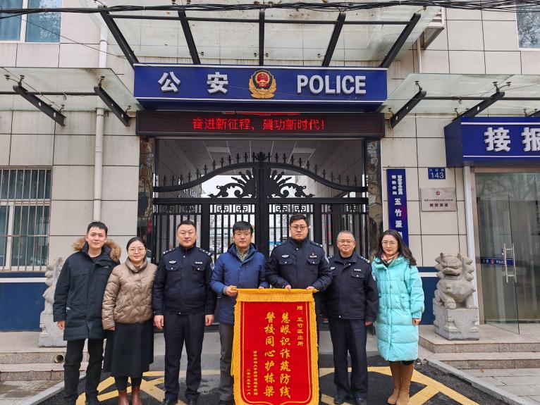 1月4日,经济管理学院党委副书记赵纪飞、学生工作办公室副主任张硕、辅导员刘清、王中立专程前往五竹派出所,将一面印有“慧眼识诈筑防线警校同心护栋梁”的锦旗郑重送到五竹派出所副所长曹聪手中,以此衷心感谢派出所长期以来在校园反诈宣传、学生安全守护等工作中的辛勤付出与有力保障。