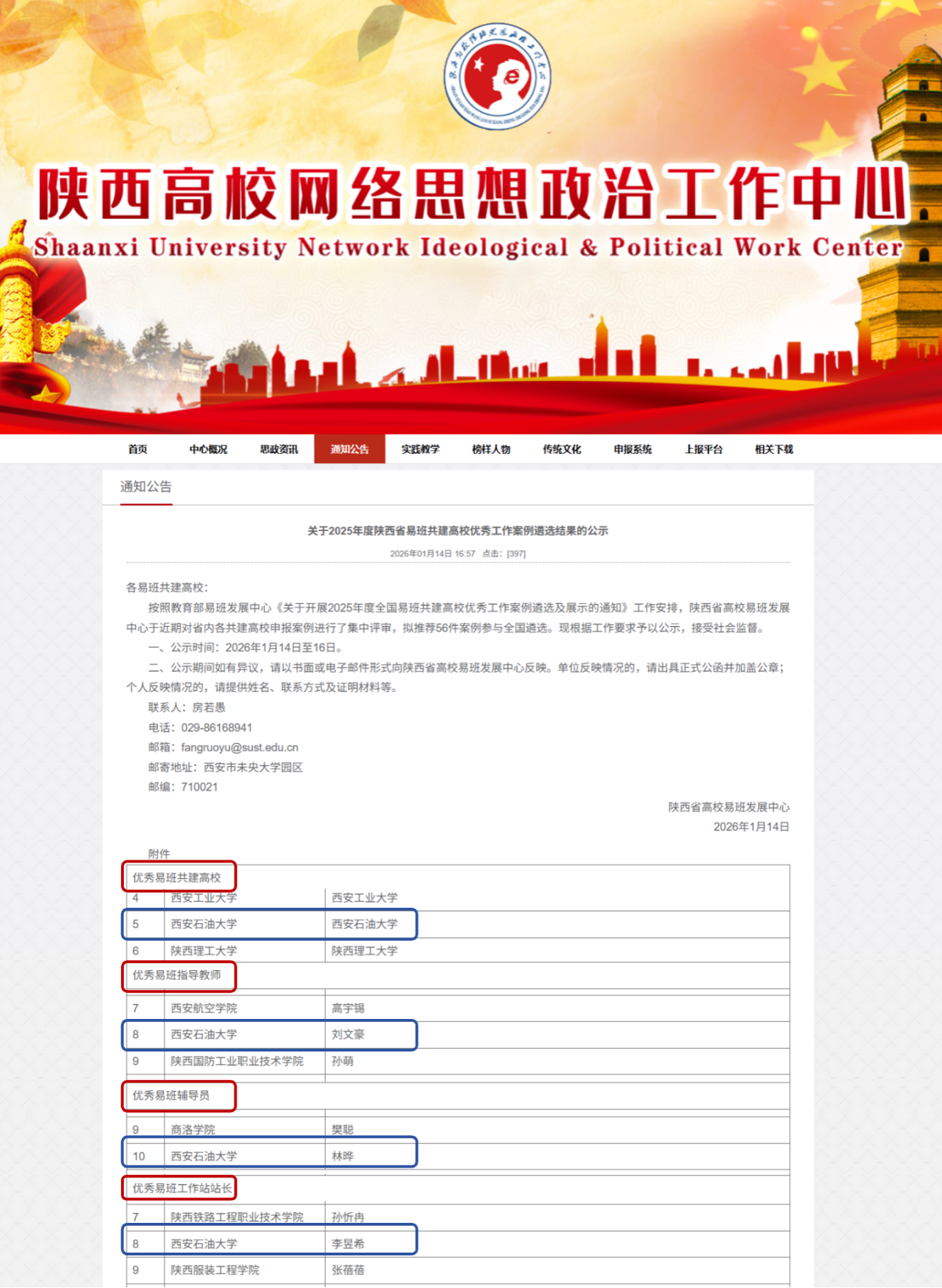近日,陕西省高校网络思想政治工作中心公布 2025 年度网络思政建设评优结果,我校易班发展中心凭借扎实的建设成效、创新的实践举措及显著的育人实效,斩获 “优秀易班共建高校” 等四项省级荣誉,实现集体与个人奖项双丰收,充分彰显了学校在网络思政育人体系建设中的综合实力与鲜明特色。