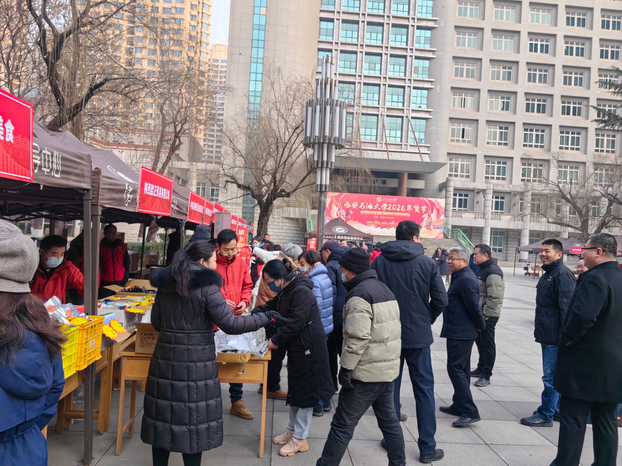 岁末寒意浓,校情暖人心。为深入落实校党委“以教职工为中心” 的发展理念,将 “幸福西石大” 建设要求转化为看得见、摸得着的民生福祉,1 月23日,由校工会、后勤处、离退休工作处、石大资产经营公司联合承办的2026 年春节教职工专属年货节在我校雁塔校区圆满举办。校党委副书记程永清,副校长张骁勇、赵健等校领导亲临现场巡展,与教职工亲切互动,共品年味、共话发展。本次活动以“品质优、价格惠、服务暖、文化浓” 的鲜明特色,成为校党委心系教职工、服务教职工的生动实践。
