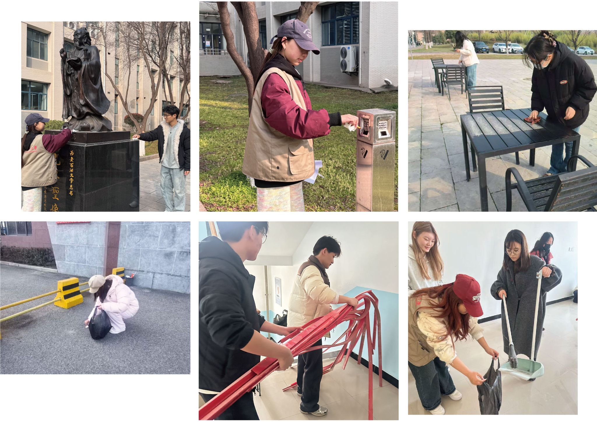 当天下午16时,活动正式启动。志愿者在各组负责人带领下,分别赴鄠邑校区东门、西门、江汉林广场、孔子雕像周边及7号宿舍楼活动室五个重点区域,开展环境卫生集中整治。大家手持扫帚、垃圾袋、抹布等工具,分工协作、密切配合,认真清理地面烟头、纸屑、落叶等杂物,细致擦拭公共设施,规范整理活动室物品,现场秩序井然、氛围热烈。