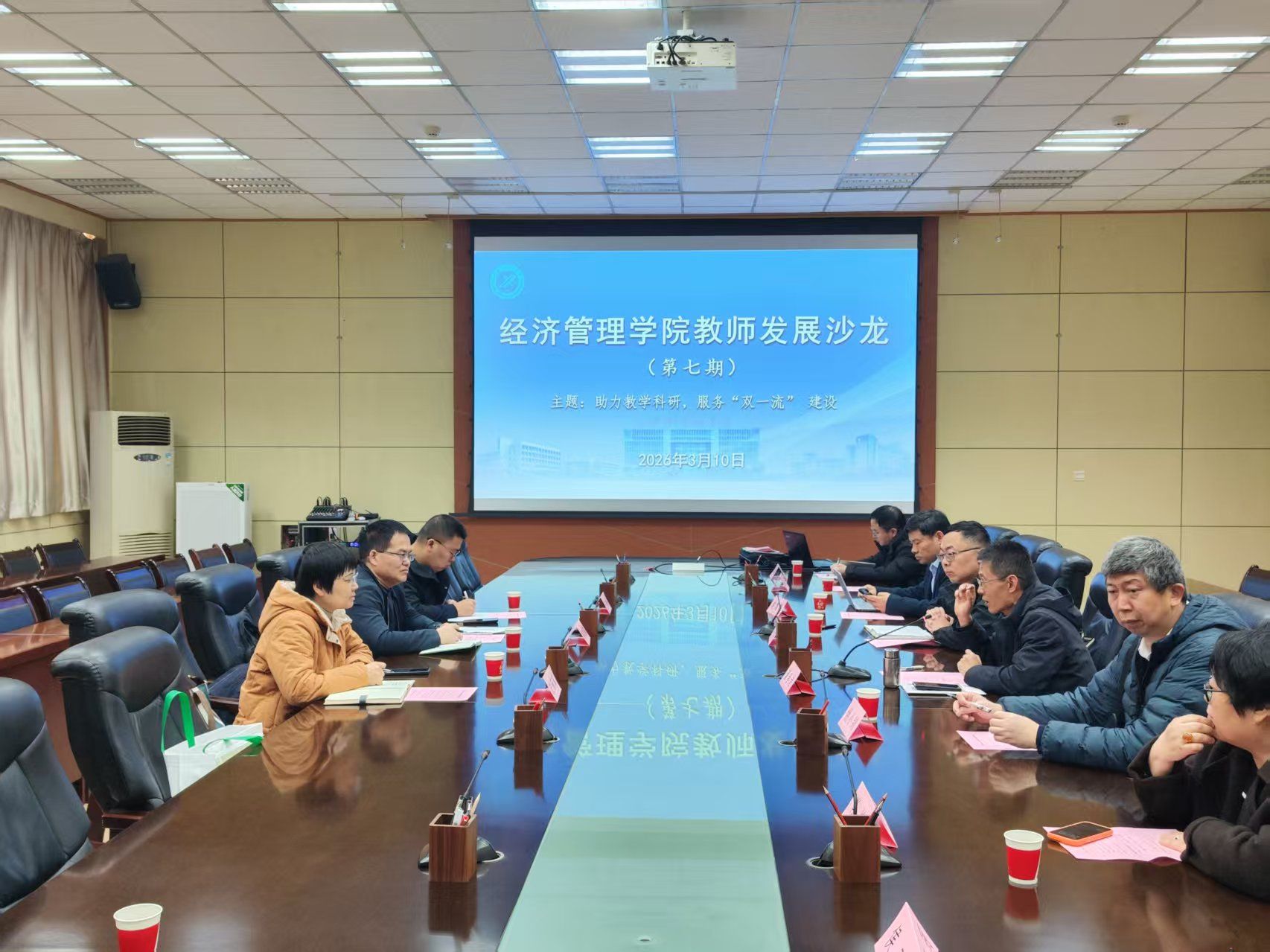 为进一步促进优质教学资源建设,提升教材编写与出版质量,3月10日上午,经济管理学院联合西安交通大学出版社在雁塔校区第一会议室举办了学院第七期教师发展沙龙。活动邀请了西安交通大学出版社副总经理兼副总编辑秦茂盛、人文社科分社主任王建洪及出版社编辑史菲菲参加活动,学院院长吴勋、各系主任、各专业负责人及教师代表参加了本次沙龙,活动由副院长董春诗主持。