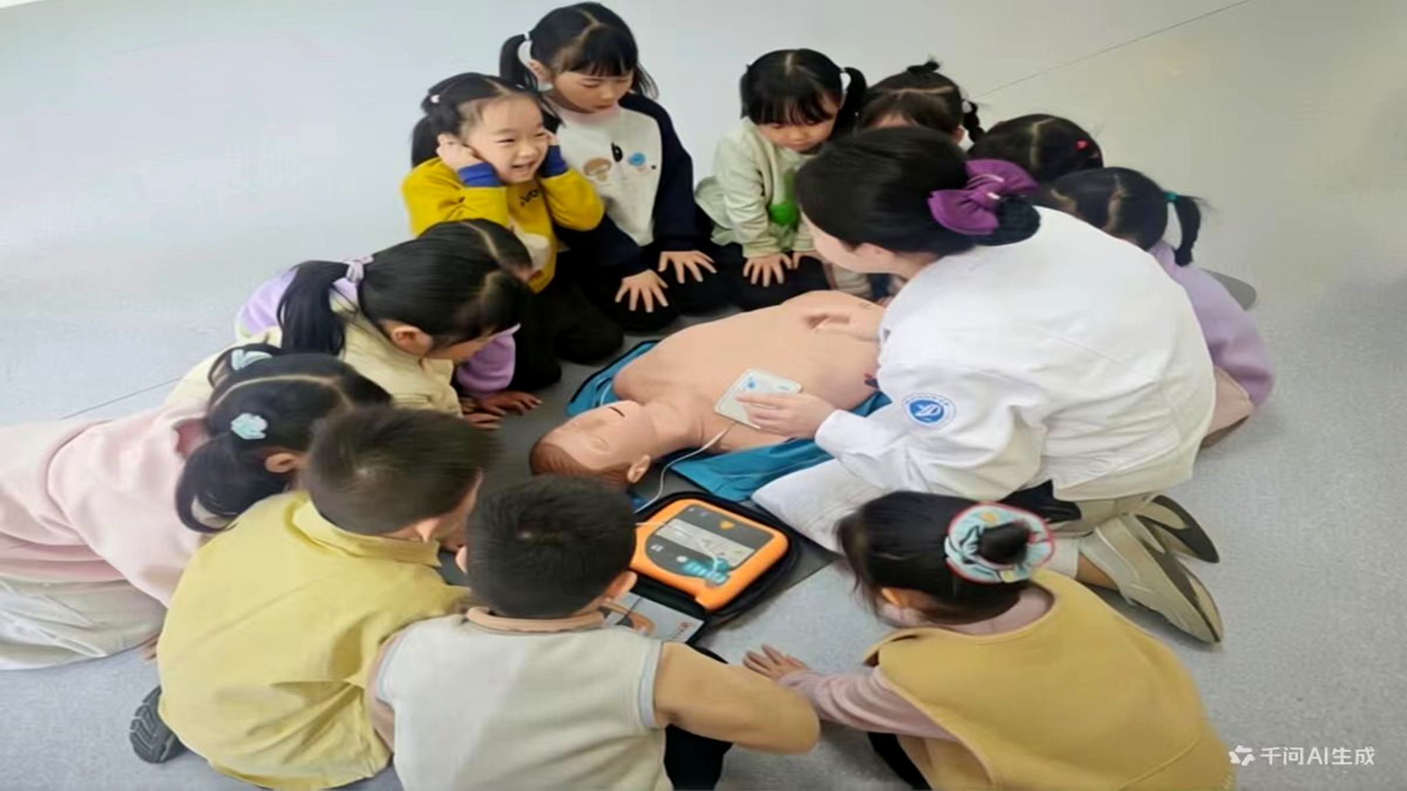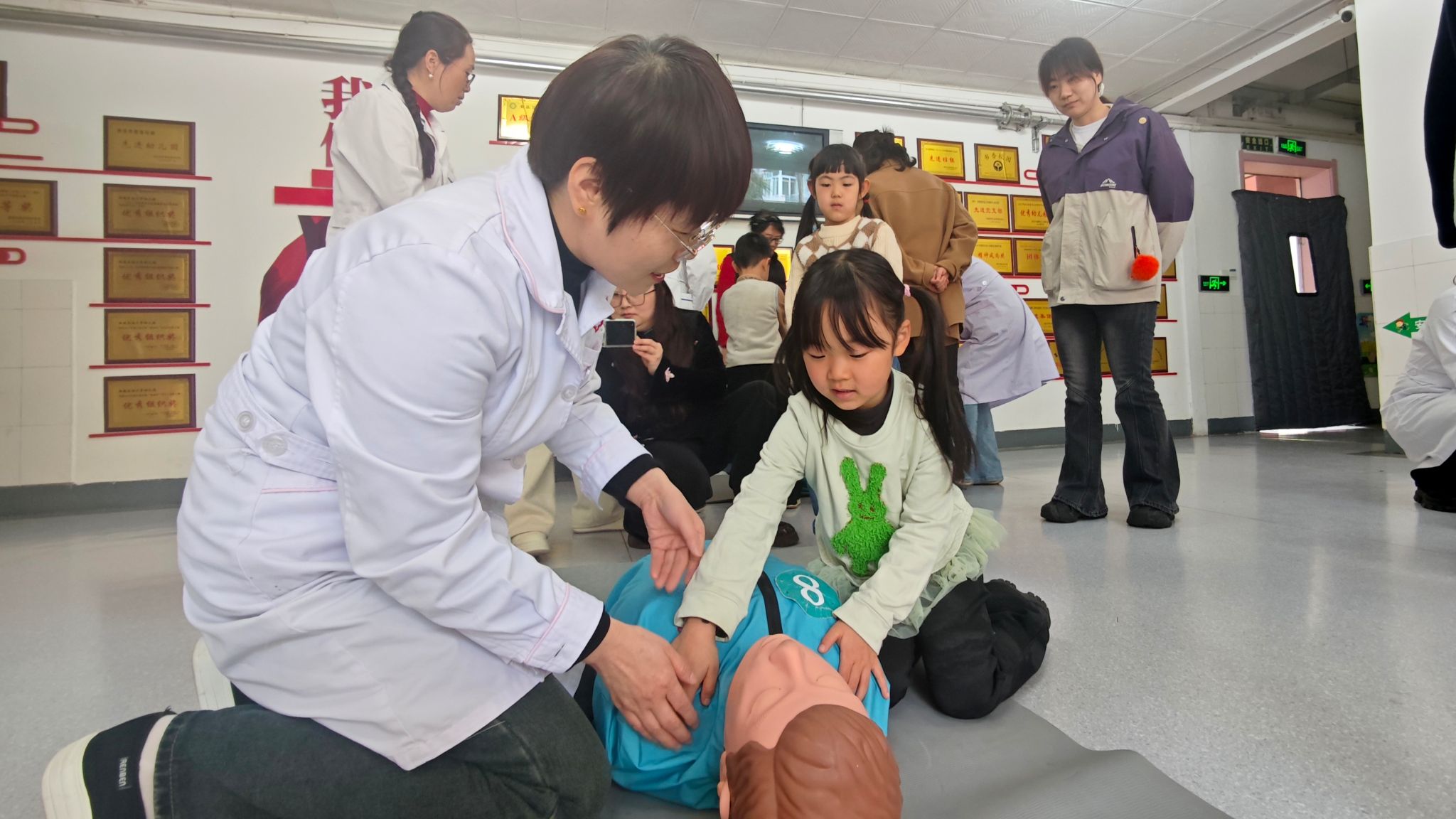 仪式结束后,校医院急救团队为幼儿园大班幼儿开展趣味应急救护培训。医护人员摒弃传统说教模式,以“抢救小熊”为主题,将专业急救知识转化为通俗易懂的趣味内容;通过仿真道具开展情景模拟与实操教学,手把手指导幼儿学习心肺复苏基础技能,认识AED急救设备,让孩子们在互动中掌握实用自救互救知识,树立自我保护意识。幼儿园教师表示,此次活动生动实用,让安全知识真正入脑入心,也培养了幼儿关爱他人的意识。