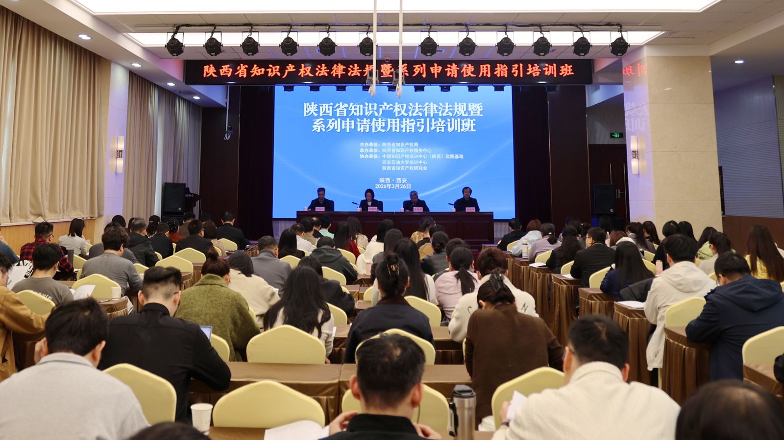 3月26日上午,陕西省知识产权法律法规暨系列申请使用指引培训班在我校明德校区顺利开班。陕西省知识产权局党组成员李晓鸣,陕西省知识产权服务中心副主任贺骁勇,我校党委委员、副校长张骁勇出席开班仪式。全省各市局地理标志工作管理人员、商标受理窗口业务骨干、知识产权保护中心预审人员、专利代理机构业务骨干、部分创新企业相关人员及省知识产权局机关干部等120余人参加培训。陕西省知识产权局政策法规处处长姚凯学主持开班仪式。