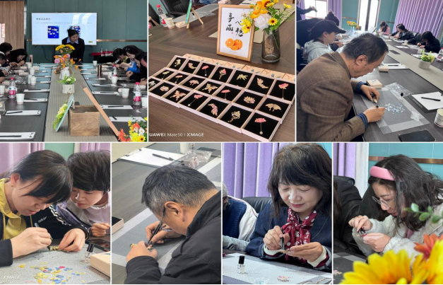 党课悟思想,铁魂融指尖。接下来的非遗螺钿手作环节将红色文化与传统工艺相融,以“指尖匠心传初心,巧手精工铸信仰”为理念,全体教师在专业老师的指导下,沉浸式体验螺钿胸针打磨、镶嵌、塑形的全过程。制作中,大家以“严细实”的工作作风要求自己,对每一片贝壳原料精挑细选,每一次打磨精益求精,每一处镶嵌一丝不苟,正如铁人先辈勘探油田时追求精准、打磨技艺时力求极致的执着,也与外语教学中对语言细节的精研、对育人质量的坚守高度契合。本环节将红色元素融入螺钿创作,让非遗技艺成为承载初心使命的生动载体。大家在亲手制作中,深刻体悟“以匠心守初心、以精工践实干”的精神内涵,让正确政绩观在指尖实践中入脑入心,让铁人精神在精雕细琢中根植于心、见于行止。