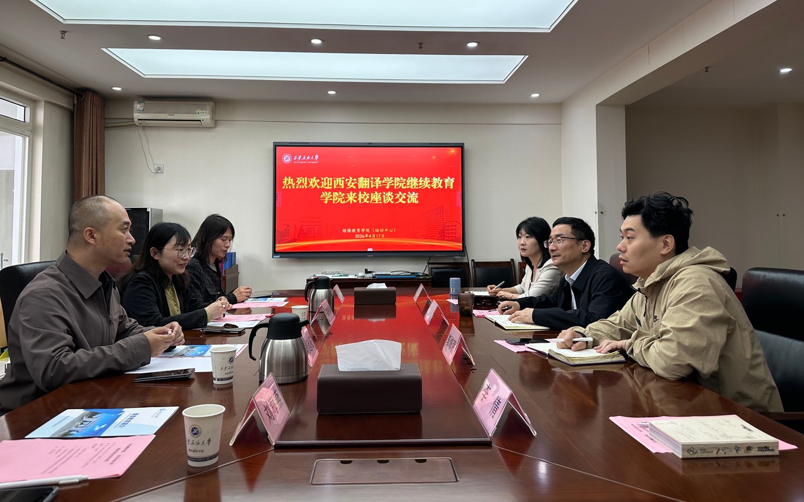 4月17日上午,西安翻译学院继续教育学院副院长刘远征一行4人来校座谈交流,我校继续教育学院副院长丁昌峰及相关部门负责人参加会议。