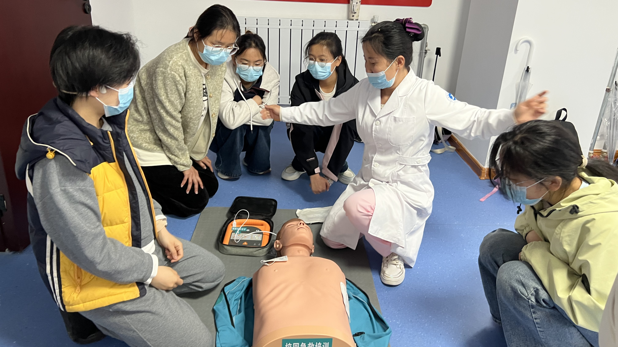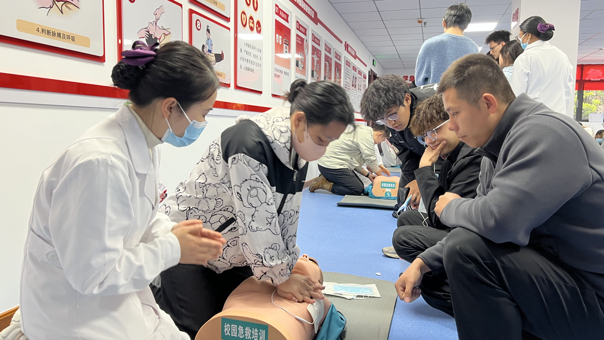 理论授课环节,校医院急救团队吴银娜讲师结合校园真实急救案例,用通俗易懂的语言,系统讲解心肺复苏(CPR)、AED操作、海姆立克急救法三大核心急救知识,细致拆解操作流程、明确关键注意事项、纠正常见急救误区,为参训师生夯实专业理论基础。实操演练中,全体师生分组展开练习,讲师借助心肺复苏模拟人、AED训练机等专业设备,逐一指导按压手势、发力节奏等动作细节,现场纠正操作偏差,确保每位学员掌握规范急救技能。